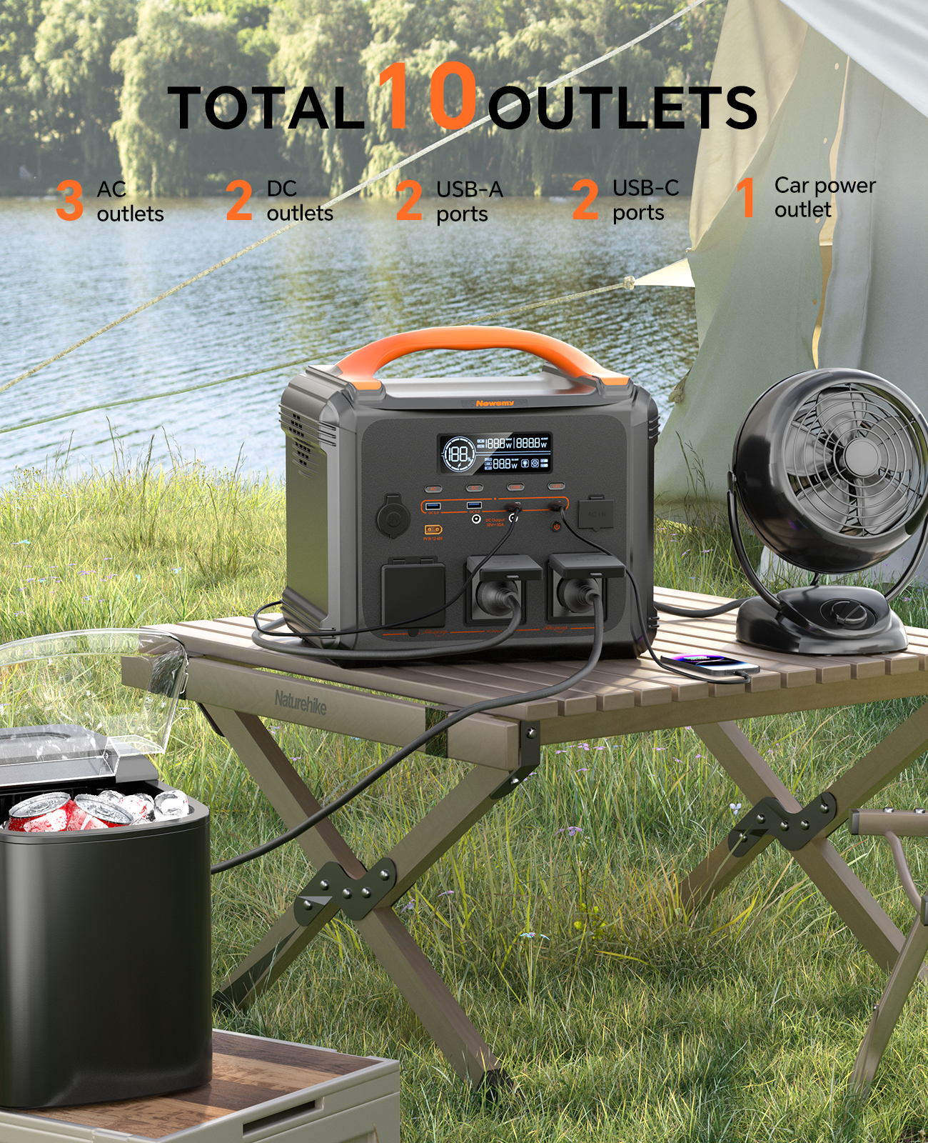 Versatile Outlets: This power station is equipped with 3 AC outlets (230 V, 2000 W; 2000 W peak), 2 USB-A ports, 2 USB-C ports, 2 DC ports, and 1 car outlet. You can connect up to 10 devices simultaneously.